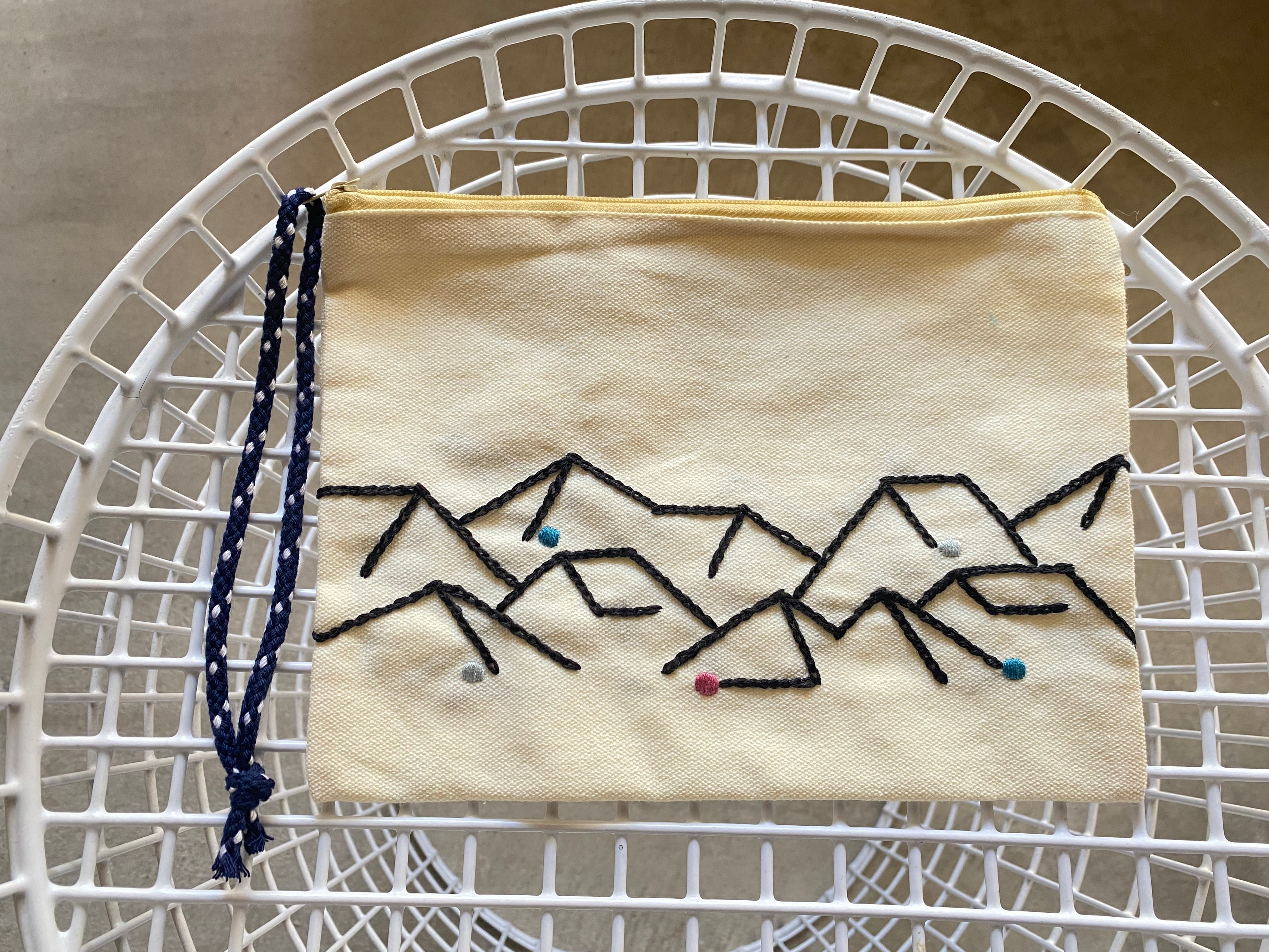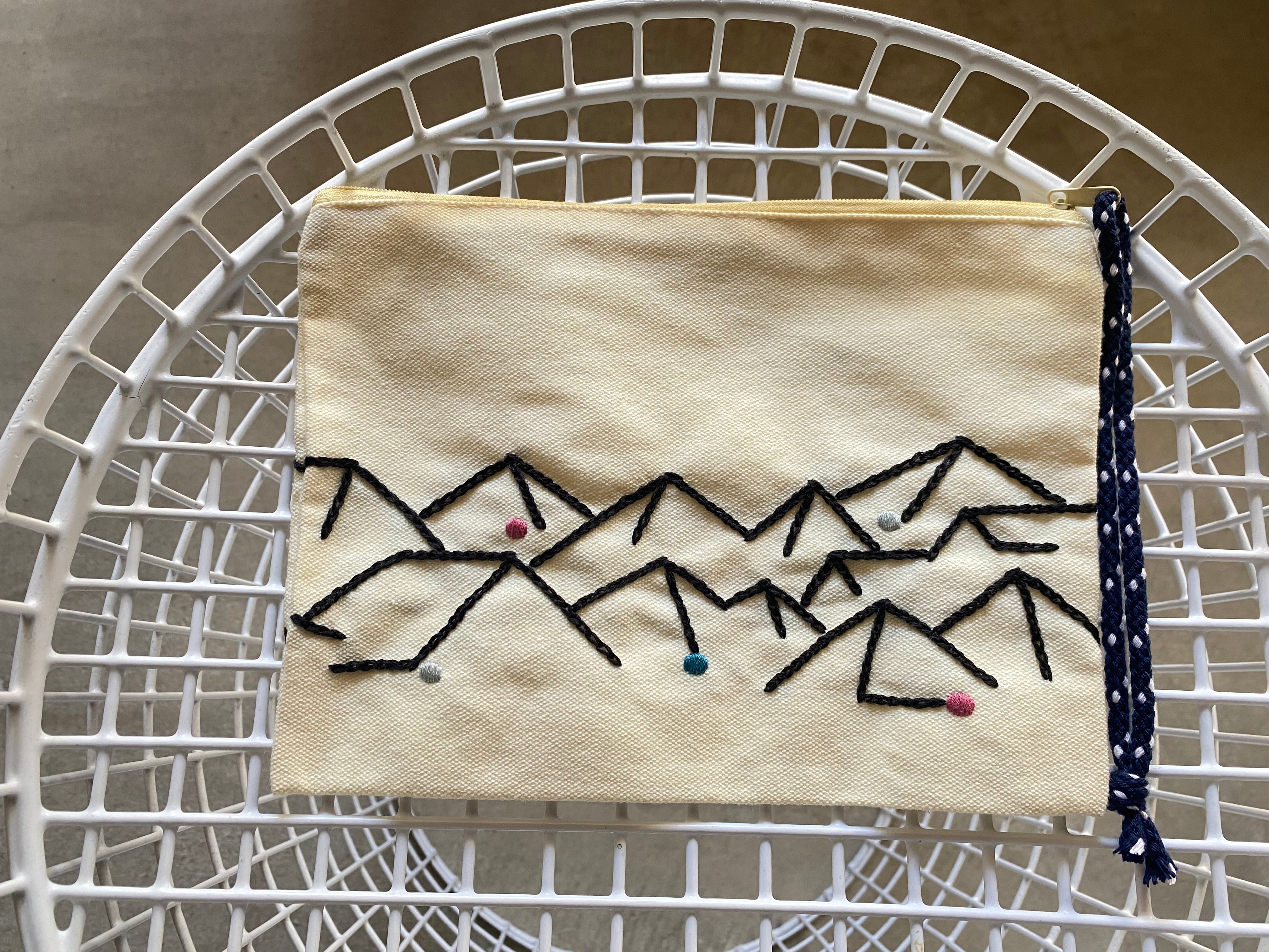 山の稜線の刺繍のポーチ 両面刺繍となります。 山のポイントにドットが入っています。 マチなしですが案外たっぷり物を入れる事ができる バックの中がスッキリする便利ポーチです。 size:22.5cm×17.5cm material:コットン